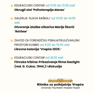 Povodom Nacionalnog dana prava osoba s duševnim smetnjama, Klinika za psihijatriju Vrapče i ove godine organizira bogat i raznovrstan program događanja, koji će se održati u petak, 6. lipnja 2025., na više lokacija unutar bolničkog kruga.