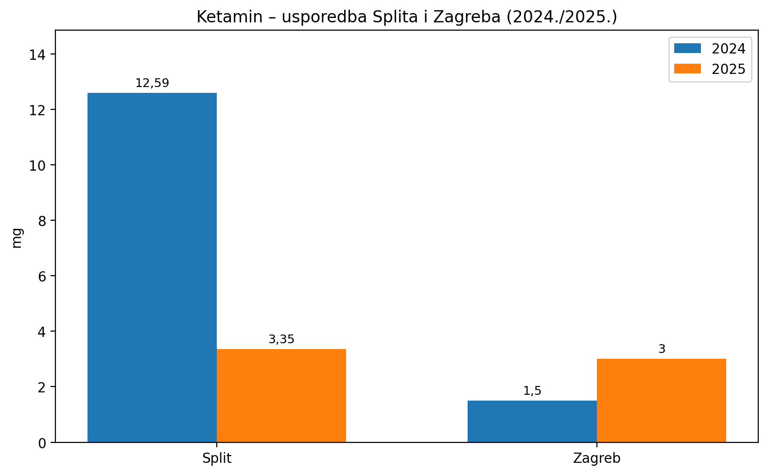Ukupna količina ketamina u otpadnim vodama porasla je za gotovo 41 % između 2024. i 2025. godine u gradovima koji su dostavili usporedive podatke. Od ukupno 66 gradova, njih 40 (61 %) zabilježilo je porast razina ketamina, 14 (21 %) stabilne vrijednosti, dok je u 12 gradova (18 %) evidentiran pad.