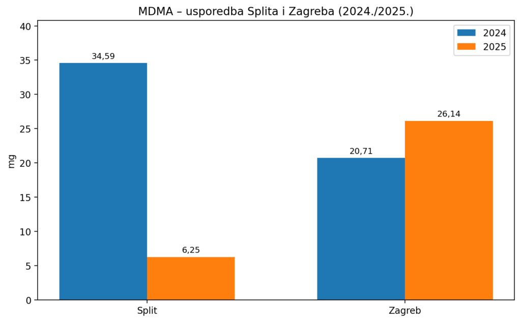 Ukupna količina MDMA u otpadnim vodama smanjila se za 16 % između 2024. i 2025. godine u gradovima koji su dostavili podatke za obje godine. Od ukupno 78 gradova s usporedivim podacima, njih 48 (62 %) zabilježilo je pad razina MDMA, 12 (15 %) stabilne vrijednosti, dok je u 18 gradova (23 %) zabilježen porast.