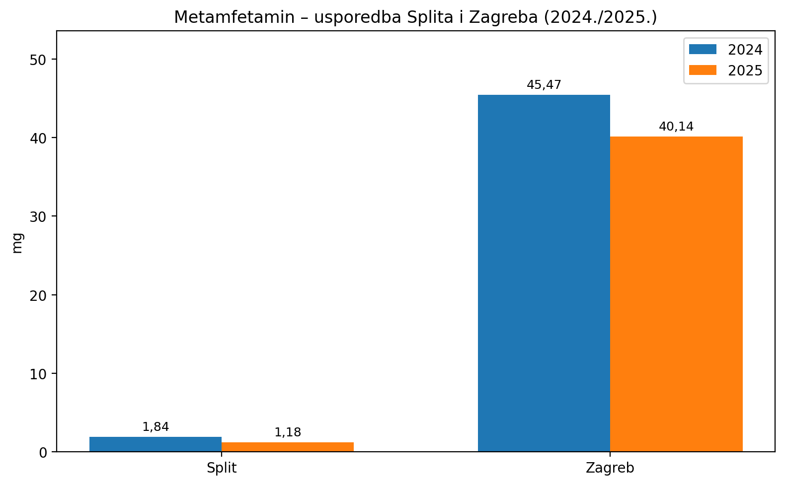 Od ukupno 80 gradova s usporedivim podacima za 2024. i 2025., njih 37 (46 %) prijavilo je porast razina metamfetamina, 28 (35 %) pad, dok je u 15 gradova (19 %) stanje ostalo stabilno.
