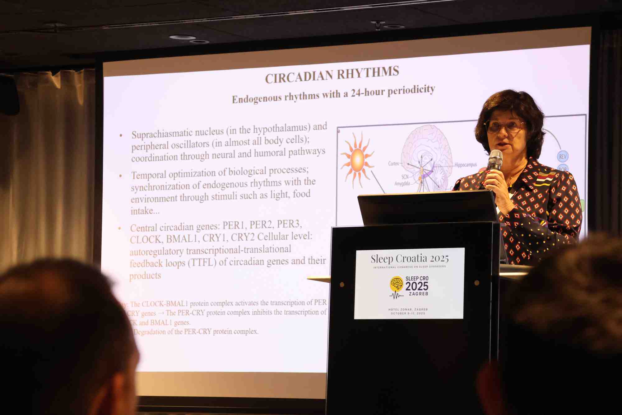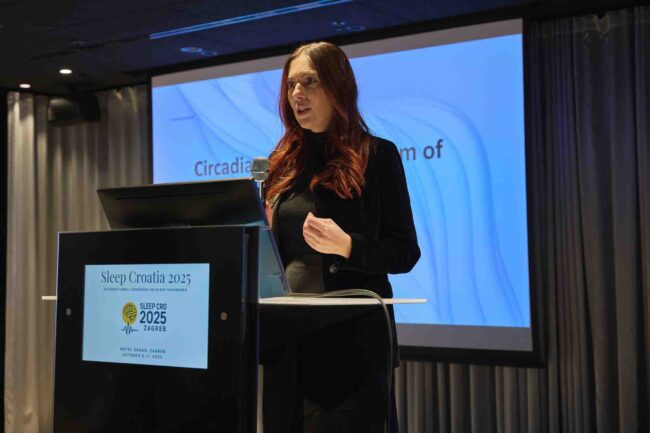 Doc. dr. sc. Barbara Barun predstavila je neurofiziologiju spavanja i poveznice s kardiometaboličkim rizicima i kognicijom, naglasivši kako se kvaliteta spavanja izravno odražava na dugoročne ishode. Dr. Ana Marija Šantić prikazala je osobitosti strukture spavanja kod oboljelih od opstruktivne apneje u spavanju i PTSP-a — fragmentaciju spavanja, smanjen udio sporovalnog spavanja i REM disrupcije koje utječu na dnevno funkcioniranje i terapijske rezultate. Prof. dr. sc. Dinko Mitrečić govorio je o dvosmjernoj vezi spavanja i neurodegeneracije: poremećaji spavanja mogu ubrzavati neurodegenerativne procese, dok rane neurodegenerativne promjene mijenjaju obrasce spavanja — argument za ranije prepoznavanje i ciljane intervencije. Na to se nadovezao doc. dr. sc. Aleksandar Savić s fokusom na personaliziranu medicinu spavanja i integraciju intervencija usmjerenih na spavanje u specijalizirane programe.