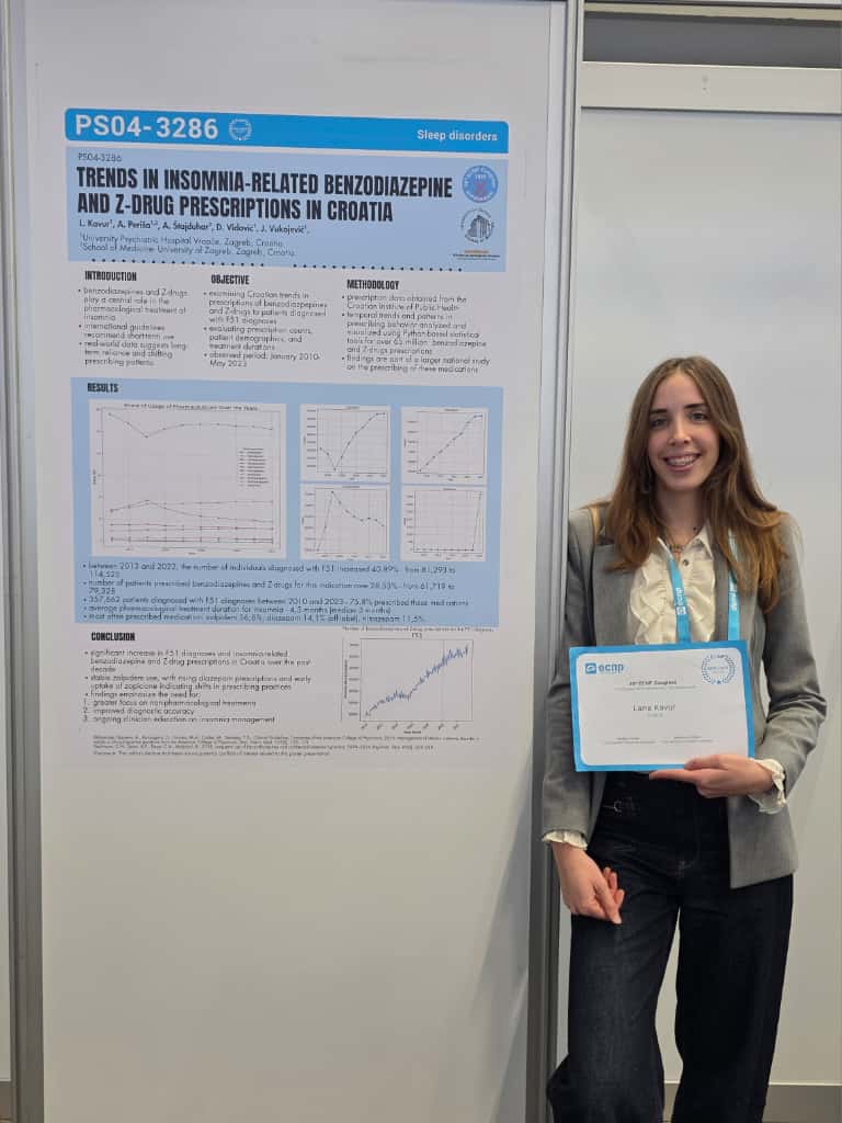 Posebno ističemo izlaganje dr. Lane Kavur, koja je predstavila sažetak “Trends in insomnia-related benzodiazepine and Z-drug prescriptions in Croatia” (Kavur L., Periša A., Štajduhar A., Vidović D., Vukojević J.). Za ovaj je rad dr. Kavur dodijeljena ECNP Excellence Award, priznanje koje prepoznaje izvrsnost mladih istraživača u europskoj znanstvenoj zajednici.